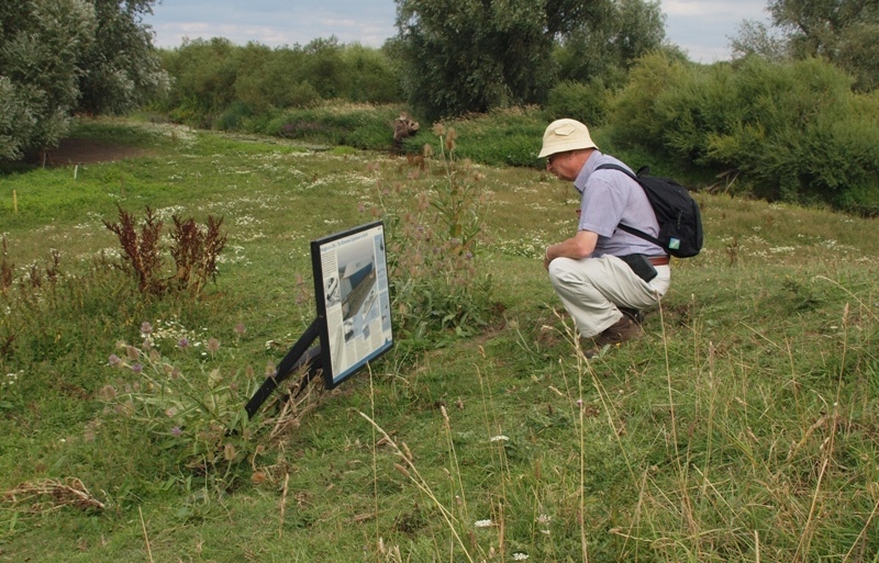 The site of the board is also strange, being at ankle level to those on the footpath, and on a steep slope making closer inspection to read the small print rather difficult, as my friend and fellow local historian Chris Holley demonstrates below. It is also furthest away and facing away from Sutton Gault from where most walkers approach.